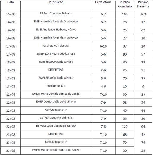 O tema musicalidade conduzirá as atividades deste ano, que acontecerão de manhã e à tarde, em 4 horários de atendimento. A expectativa é acolher até 400 alunos por dia (100 em cada horário). Poderão participar escolas, públicas e privadas, de educação infantil, ensino fundamental e médio, além de instituições e outros grupos.
